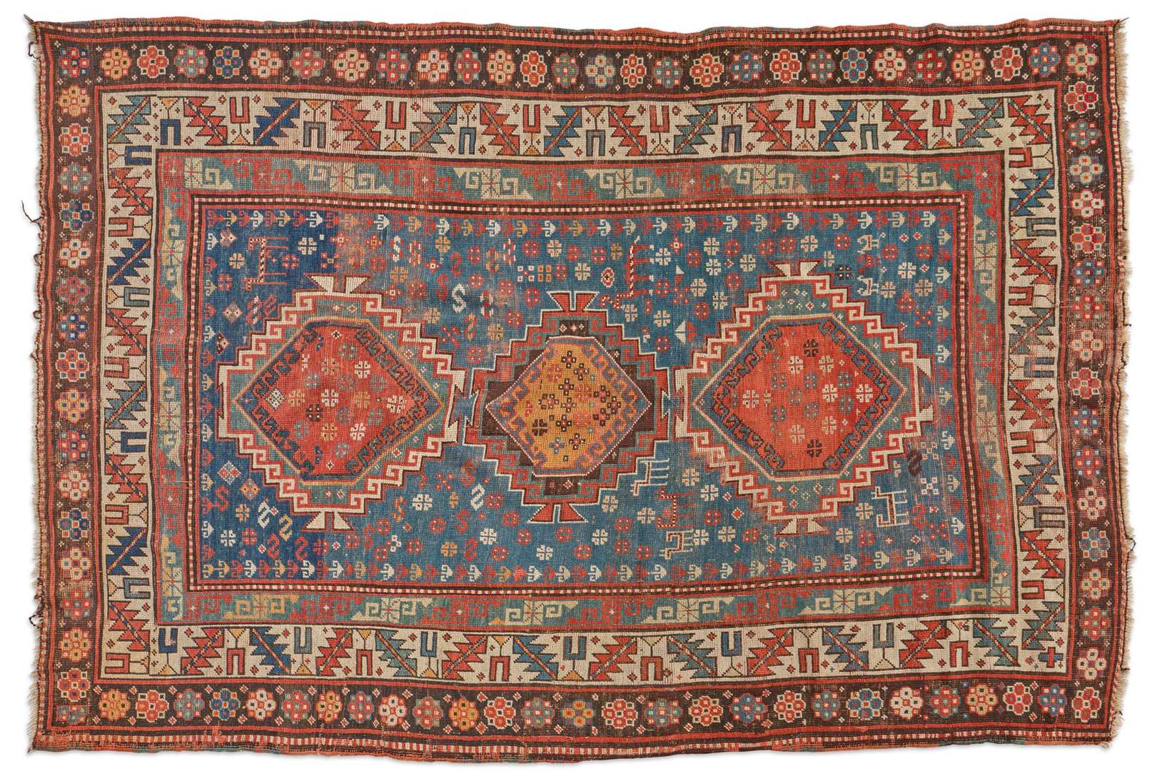 Champ bleu de Prusse abrashé à multiples symboles représentatifs du sol, orné de trois médaillons géométriques polychromes. Triple bordure dont la principale ivoire à calices et feuilles de chêne. Terminaisons effrangées.