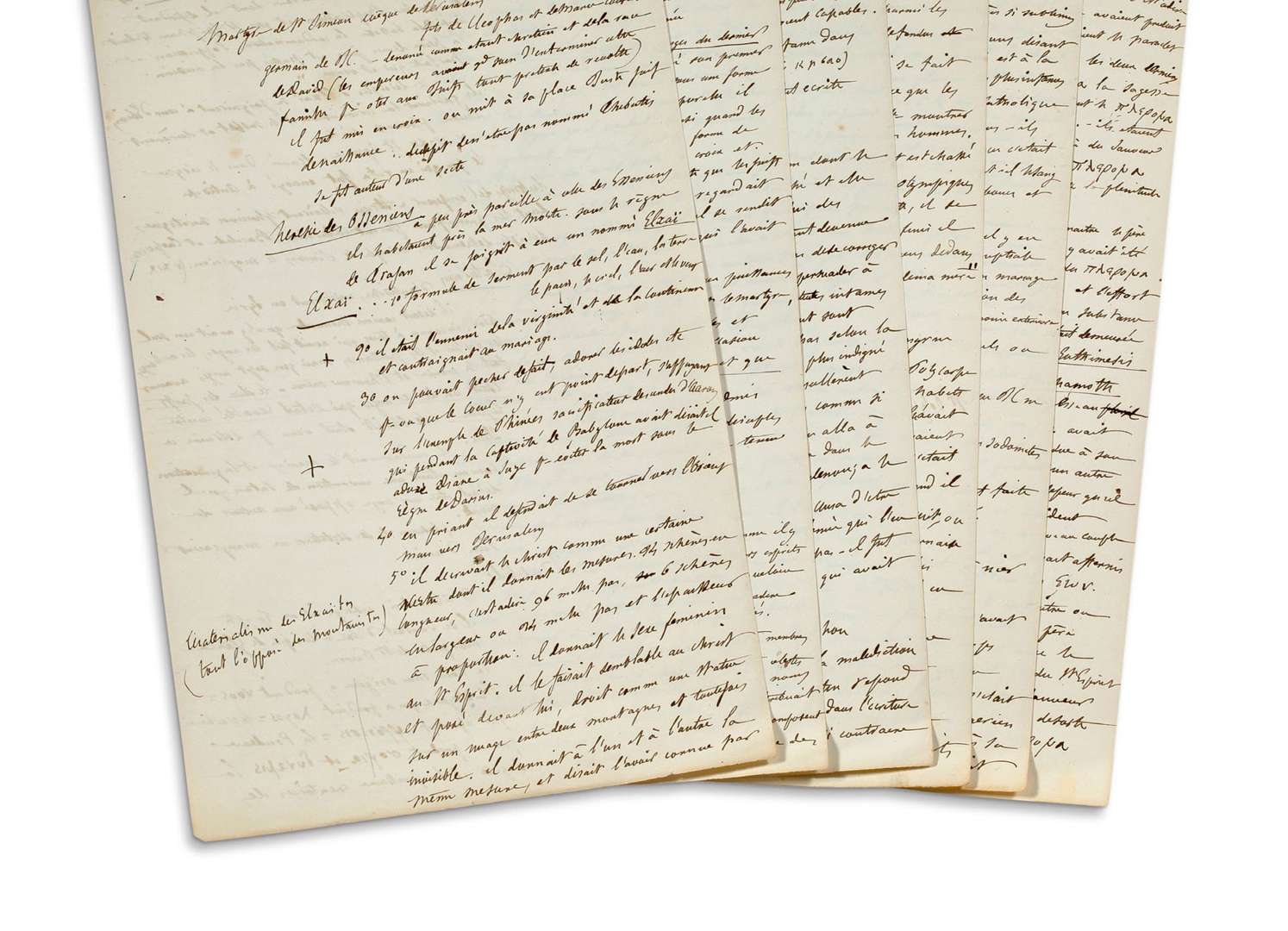 Travail préparatif à la troisième version de La Tentation de Saint Antoine. Pour Flaubert, La Tentation de Saint Antoine, est « l'oeuvre de tout [sa] vie puisque la première idée [lui] en est venue en 1845, à Gênes, devant un tableau de Brueghel, et depuis ce temps-là, [il n'a] cessé d'y songer et de faire des lectures afférentes », comme il l'indique dans une lettre de 1872. En effet, en 1849, il achève une première version (restée manuscrite et parue posthume), y revient en 1856, puis, enfin, en 1874, il transforme l'oeuvre ancienne pour en former une toute différente. Le présent manuscrit s'apparente à un mémento documentaire dont Flaubert était coutumier, c'est-à-dire à des prises de notes d'une de ces « lectures afférentes », très probablement une histoire des premiers temps de l'Église (en tête la mention « Livre III »). Ces notes concernent les hérésiarques et les premiers chrétiens. Elles furent probablement rédigées vers 1869, date à laquelle Flaubert débute la refonte de son livre, puisque les noms cités dans le manuscrit, absents de la première et seconde version, apparaissent dans la quatrième partie de la version définitive du texte. Ce manuscrit témoigne parfaitement de la manière dont Flaubert mélange érudition et invention, passion documentaire et stylistique. Il se présente comme une liste de renseignements biographiques et théoriques sur la doctrine et les martyres des premiers chrétiens et des hérétiques des premiers siècles de l'ère chrétienne. Flaubert mentionne le « Martyre de St Siméon évêque de Jérusalem », l'« Hérésie des Osseniens à peu près pareeeeeeille à celle des Esseniens », « Saturnin d'Antioche, enseignant en Syrie », « Basilide d'Alexandrie », « Carporas », les « Gnostiques », « le fils de Carporas Épiphane qui continua sa doctrine », l'« Hérésie de Valentin » (il la détaille longuement sur 2 pages en utilisant des noms écrits en grec), les autres Valentiniens « les Sethiens », « les Caïnites », « les Ophites », l'« Hérésie de Marcion et d'Apelle », les martyres de St Justin et de St Polycarpe, et enfin « Peregrin ». À partir du verso du cinquième feuillet, les notes s'achèvent sur une série de citations plus ou moins longues extraites de la Seconde Apologie de Saint Justin concernant la justification « de la doctrine chrétienne », « le Martyre de Ptolémée » et un « dialogue de St Justin avec Triphon »...