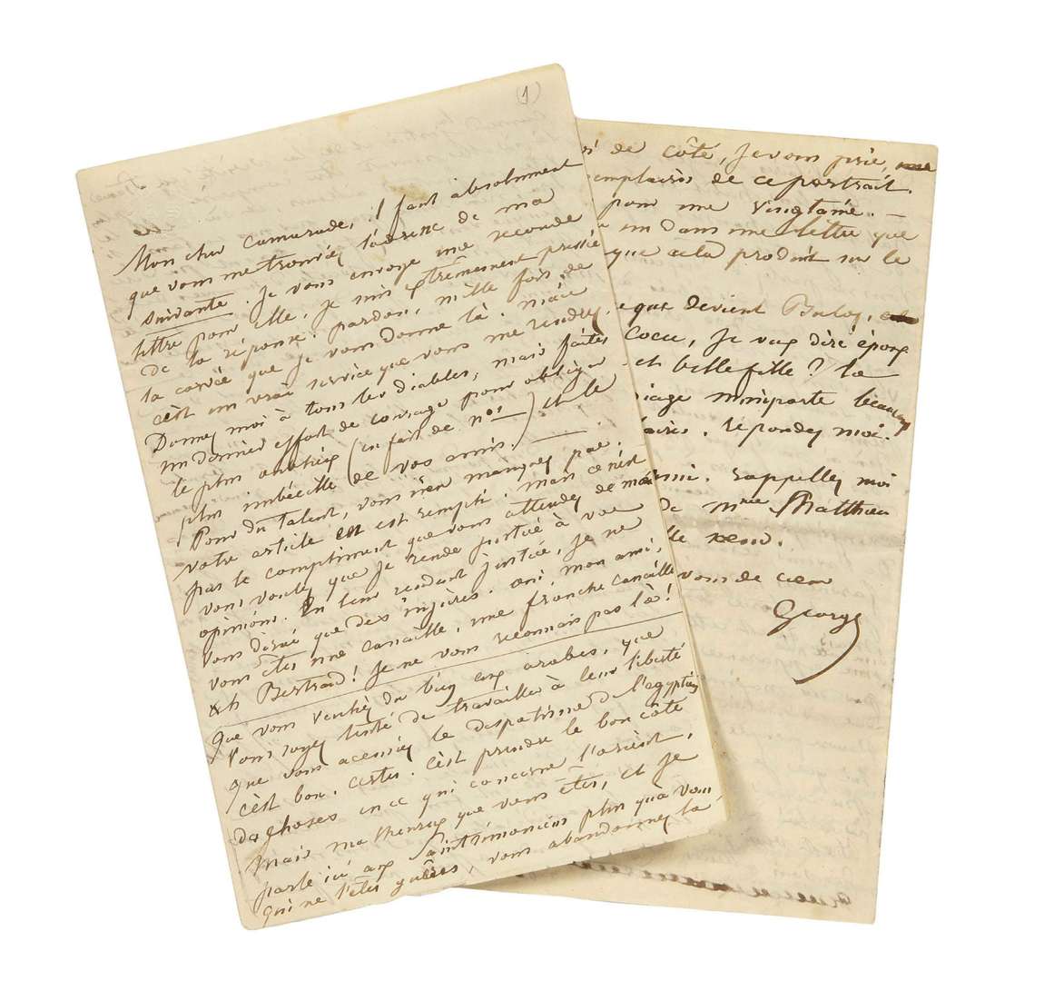 Très belle et longue lettre politique, à propos des saint-simoniens et de l'Égypte. [Sand réagit à l'article d'Adolphe GUÉROULT (1810-1872), dans le Journal des Débats, à propos du transport de l'obélisque de Luxor jusqu'à Paris.]... « Pour du talent, vous n'en manquez pas | votre article en est rempli. Mais ce n'est pas le compliment que vous attendez de moi, vous voulez que je rende justice à vos opinions. En leur rendant justice, je ne vous dirai que des injures. Oui, mon ami, vous êtes une canaille, une franche canaille. [...]