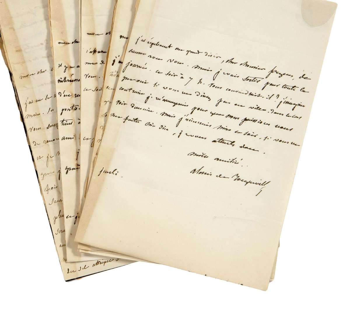 Belle correspondance amicale, sur la politique et le journalisme, et leur collaboration au journal Le Commerce. [Le journaliste, critique et traducteur Émile FORGUES (1813-1883) collaborait notamment à la Revue britannique, à L'Illustration. Tocqueville participe à la direction du journal Le Commerce.] Tocqueville 23 août 1844. Il regrette d'avoir quitté Paris sans saluer Forgues. « Les affaires du dernier jour, ce dernier jour qui vous surprend sans cesse en toutes choses, m'ont forcé de renoncer à vous voir.
