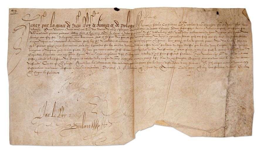 HENRI III (1551-1589) Roi de France P.S., Étampes 11 novembre 1579| contresignée par Pierre BRULART| vélin oblong in-fol.