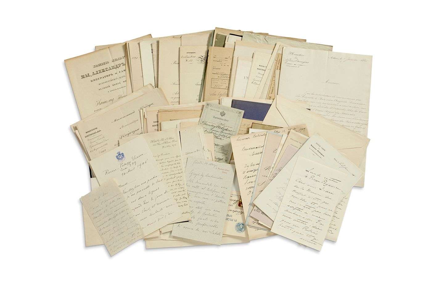 RUSSIE. Environ 150 lettres ou documents, la plupart L.S. ou P.S. (quelques L.A.S.), 1849-1918, adressés à Alexandre ou Dimitri NELIDOV ou les concernant | principalement en russe, nombreux en-têtes et vignettes.