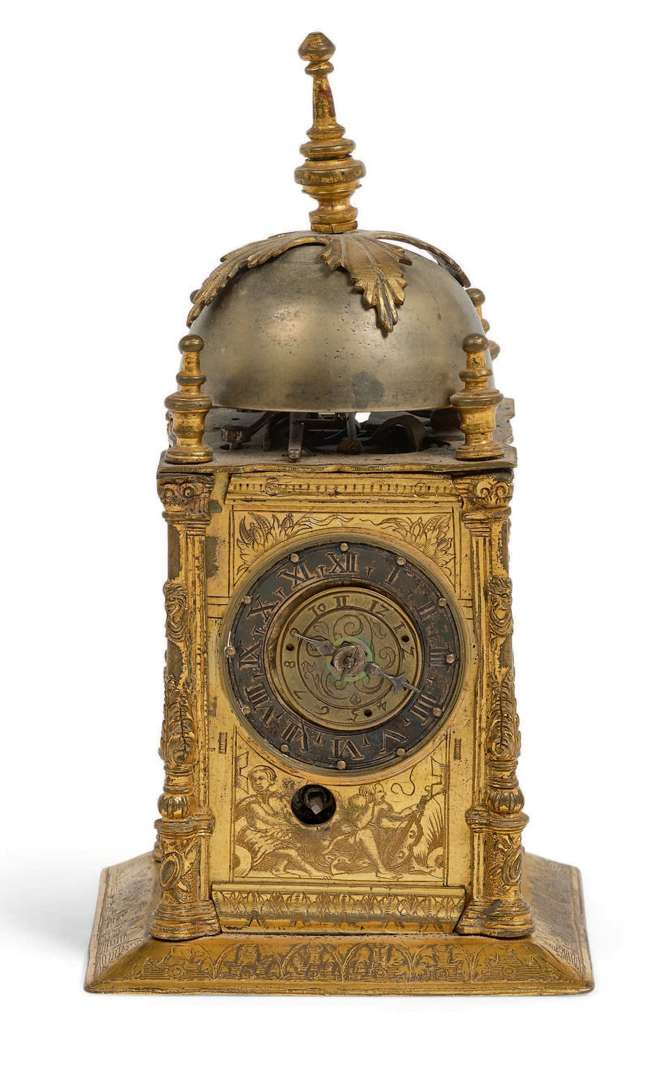 La période de la Renaissance a connu un développement important dans le domaine de l'horlogerie domestique, notamment cette production allemande de petites horloges ou encore les fameuses « Türmchenuhr » cette grande horloge si particulière. Ces horloges domestiques étaient produites dans les centres horlogers les plus réputés de l'époque, notamment à Nuremberg, Augsbourg, mais aussi dans d'autres villes comme Strasbourg ou Ulm. À la fin de la Renaissance, Augsbourg était le fournisseur le plus important de toute l'Europe. C'est la miniaturisation de l'horloge qui a amené à la naissance des premières horloges miniatures que l'on appellera « montres » dérivé du latin « monstrare » signifiant « montrer » ou « indiquer ». C'est d'ailleurs ce qui à l'époque définissait bien l'utilisation première de ces petites horloges tours qui n'étaient pas des instruments de précision mais plutôt des objets d'apparat réservés au clergé ou à la noblesse, ce qui explique que beaucoup d'entre elles ont été modifiées à la fin du XVIIe siècle après l'invention du balancier pendule par Christian Huygens, comme notre exemple avec ce balancier pendule typique appelé aussi « queue de vache ».