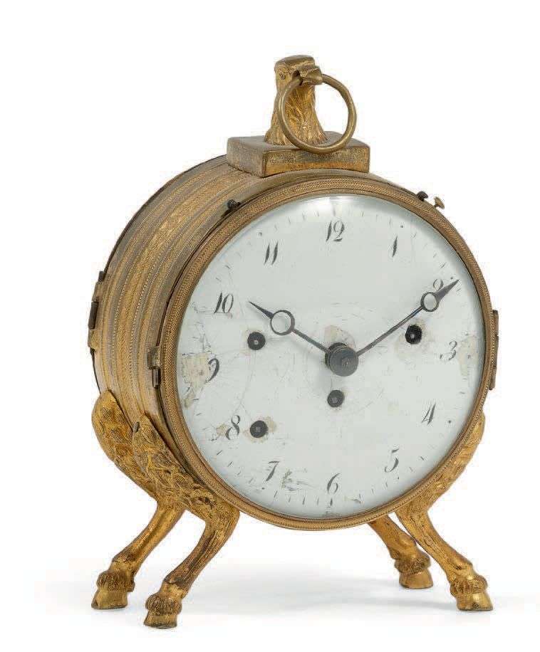en bronze doré. Boîtier sur charnière, carrure entièrement ciselée à décor de palmettes, la partie supérieure avec une bélière à tête d'un aigle impérial, le dos percé et ciselé avec décor de rosace, le tout repose sur quatre « pieds de biche ». Cadran en émail avec chiffres arabes et aiguilles de style Breguet (accidents et manques). Mouvement avec remontage à clef, double timbre avec deux marteaux pour la sonnerie, répétition des quarts, coq ciselé et percé, disque de réglage avance / retard.