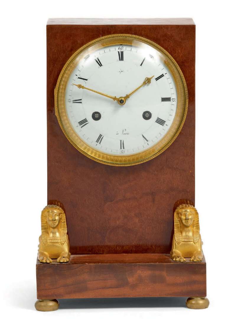 Cabinet en placage d'acajou. La base à réhaut orné de deux sphynx en bronze doré reposant sur des pieds toupies. Cadran émaillé blanc au centre avec chiffres romains pour les heures et arabes pour les minutes, deux ouvertures avec carré de remontage, aiguilles stylisées et minuterie chemin de fer, signature « Lép... à Paris ». Mouvement rond avec balancier suspendu dit « à fil », sonnerie à un marteau sur timbre.