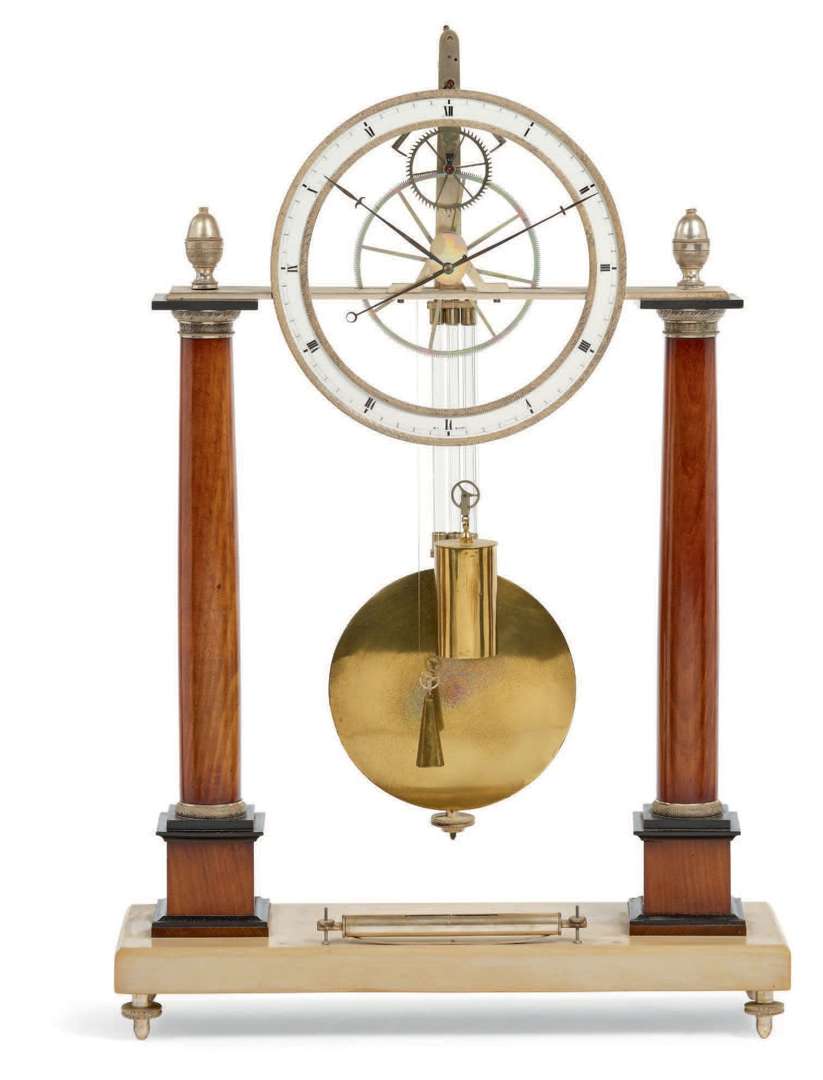 à poids avec échappement visible et balancier spécial. La partie centrale reposant sur deux colonnes en acajou avec une base quadrangulaire en pierre beige reposant sur quatre pieds ajustables, un niveau se trouve dans la partie centrale pour bien équilibrer l'ensemble. Cadran squelette reposant sur une lame fixe en métal argenté figurant un cercle émaillé blanc avec indication des heures en chiffres romains et minuterie chemin de fer, les aiguilles stylisés en forme de « lance ».