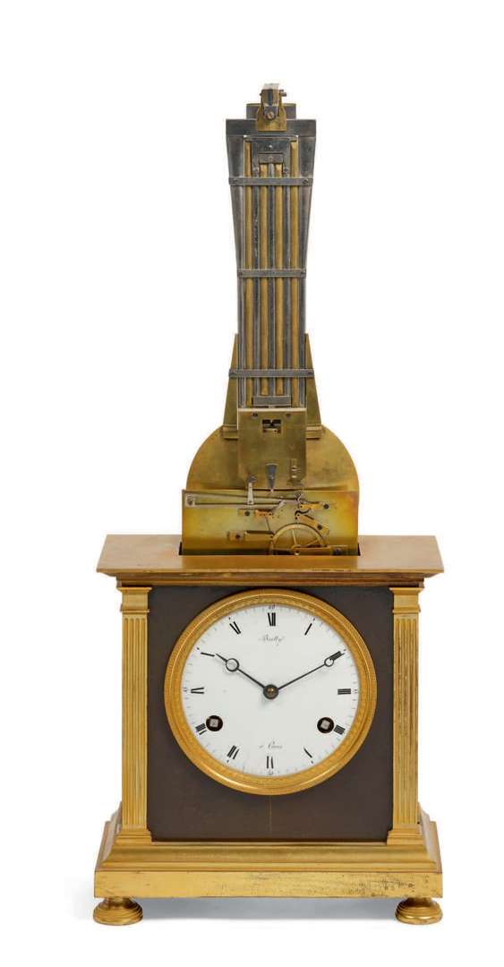 en bronze et laiton doré avec échappement à force constante à un coup perdu. La partie supérieure laissant apparaître le balancier compensé dit « gril » fixé sur une suspension à double « couteaux », la roue d'échappement visible. La partie inférieure avec le cadran en émail blanc, chiffres arabes stylisés, signé « Bailly à Paris », deux ouvertures avec carré de remontage pour le mécanisme. La base de forme carrée avec colonnes stylisées reposant sur des pieds de forme « toupie ». Mouvement avec balancier compensé et échappement à force constante, un coup perdu, signé sur la platine « V. Havelange à Liège ».