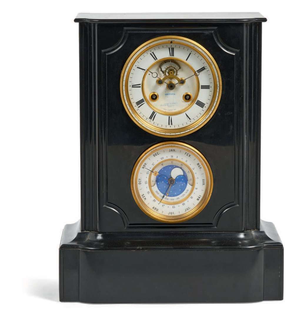 avec phases et âges de la lune, mécanisme de sonnerie avec marteau sur timbre. Boîtier en marbre noir de forme colonne avec un piètement rectangulaire à pans coupés. Double cadran dans un entourage en métal doré. La partie haute avec un cercle émaillé blanc pour l'indication des heures et des minutes sur chiffres romains, deux carrés de remontage au centre, roue d'échappement visible. La partie basse avec un cadran émaillé affichant tous les quantièmes des jours de la semaine sur une flèche dorée, l'indication des mois et du quantième de la date sur deux aiguilles distinctes, au centre une ouverture pour les phases et âges de la lune. Mouvement avec balancier de haute précision, l'échappement de ce régulateur est conçu spécialement pour ce type de régulateur, rare et très inhabituel il est réservé aux meilleurs régulateurs de table français et souvent associé à des fonctionnalités supplémentaires complexes telles que toutes ces indications astronomiques. Signature à la fois sur le mouvement et le cadran « Leroy et Fils Montpensier à Paris ainsi que Regent Street 296 London et marquée 1827 Medaille d'or à Paris ».
