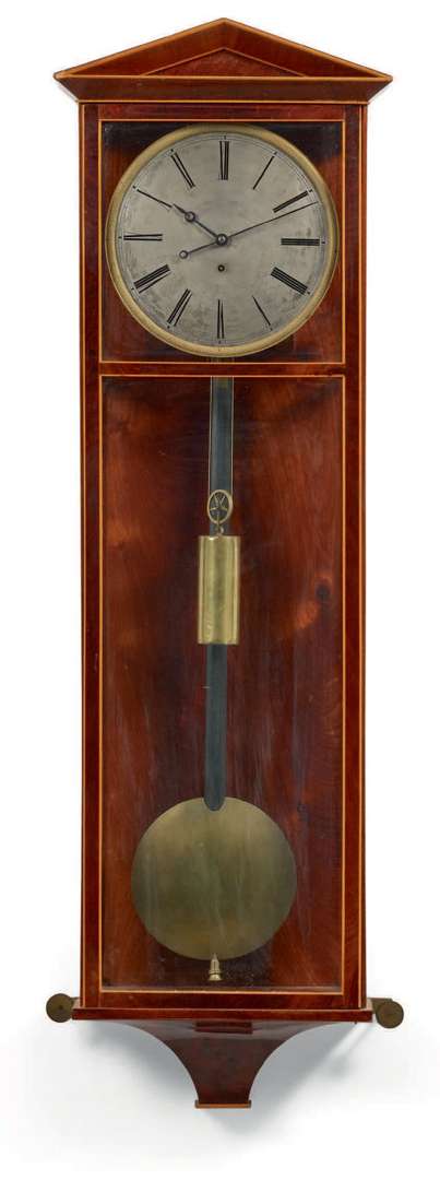 avec balancier simple. Caisse surmontée d'un chapeau en placage d'acajou entourée d'un filet de citronnier, plusieurs faces vitrées pour voir le mouvement du pendule. Cadran argenté à chiffres romains, minuterie chemin de fer. Mouvement avec balancier et contrepoids pour activer et réguler le mécanisme, un carré de remontage au centre du cadran pour armer le ressort du barillet.