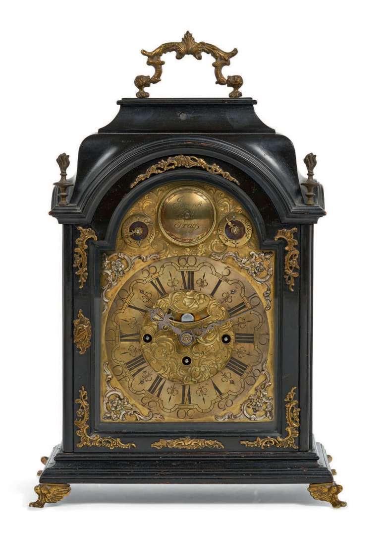 en bois noirci et bronze doré. Caisse type « religieuse » avec une poignée de transport dans la partie supérieure, les pieds retenant la base sont à motifs ailés. Le cadran richement travaillé avec chiffres romains pour les heures et arabes pour les minutes, balancier pendule visible au centre, deux cadrans auxiliaires pour les fonctions marche et arrêt du mécanisme de sonnerie. La platine du mécanisme est de forme carrée avec des ciselures feuillagées, un balancier suspension à fil « queue de vache » et deux timbres de tailles différentes pour la sonnerie.