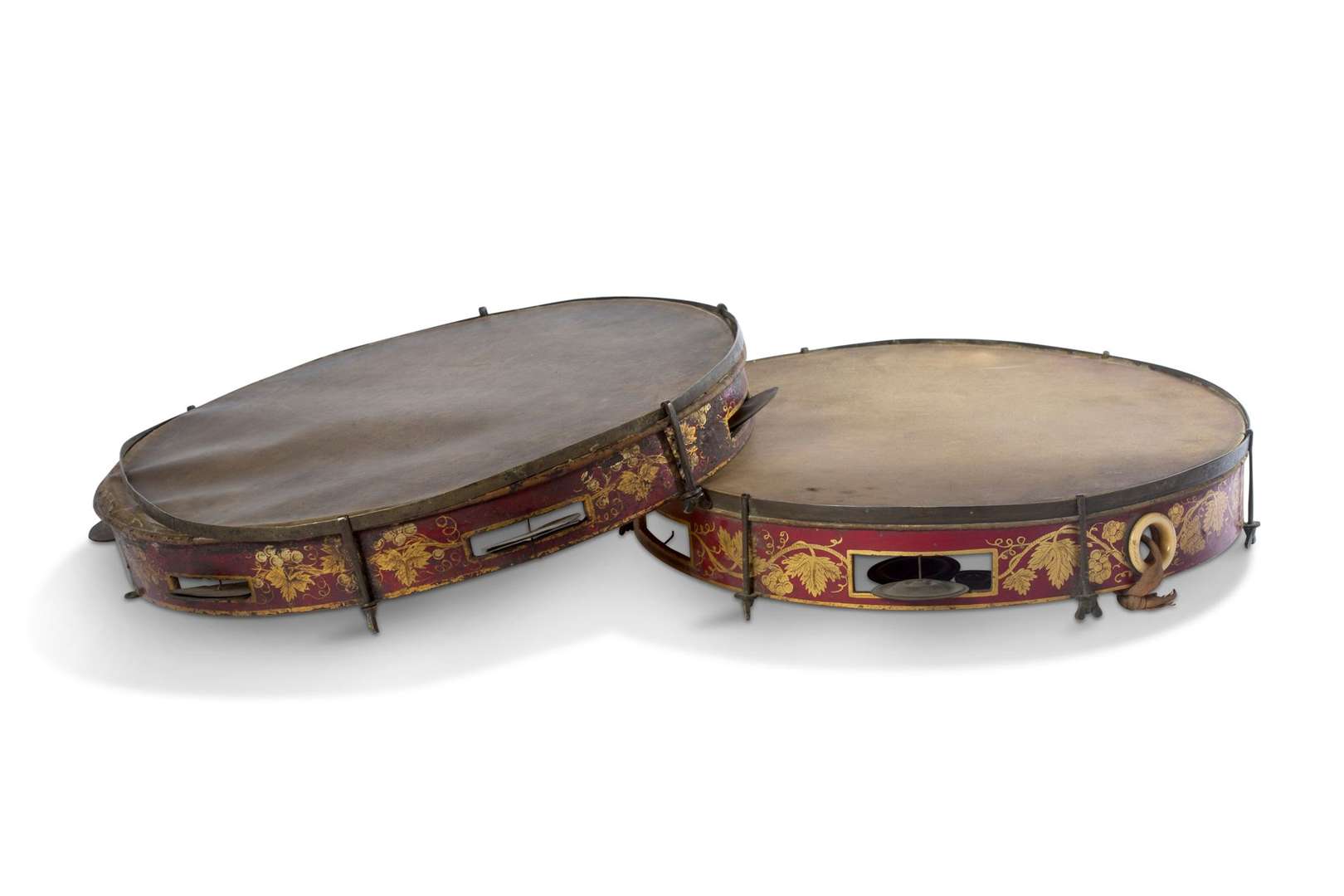 Paire de tambourins d'orchestre le pourtour en bois laqué rouge à décor de pampres de vignes.