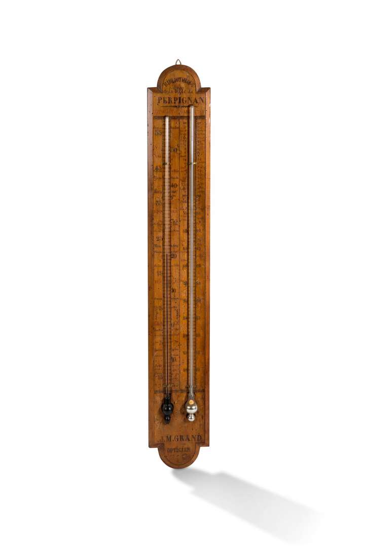 Thermomètre-Baromètre en bois à colonnes de mercure, signé «JM Grand opticien» et situé «Bibliothèque de la ville de