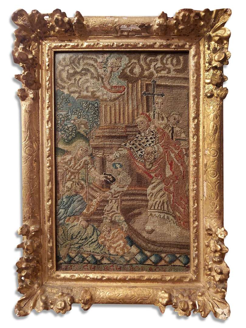 Broderie représentant un ecclésiastique distribuant des présents à des per
