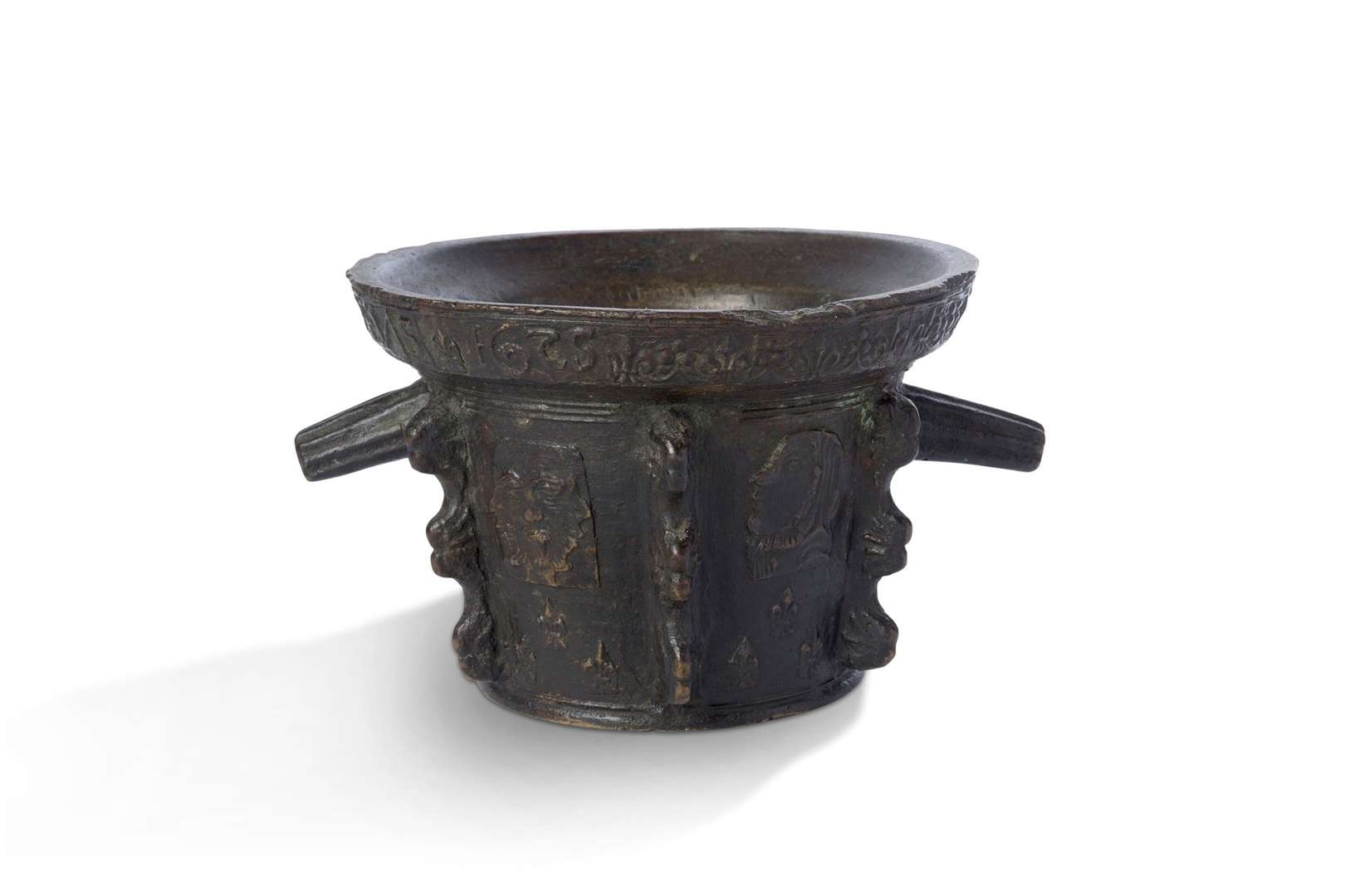 Mortier en bronze patiné de forme tronconique à deux prises cannelées et décor de fleurs de lys surmontées d'une tête de Janus et d'un portrait de femme. Inscription sur le rebord «P. DVLAVRENS 1625».