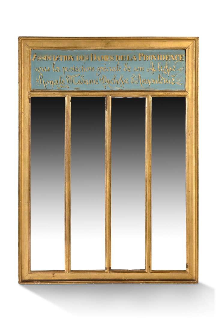 Tableau de dévotion ou de confrérie en bois doré et peint, transformé en miroir, portant l'inscription «Association des Dames de la Providence sous la protection spéciale de son Altesse Royale Madame Duchesse d'Angoulême».