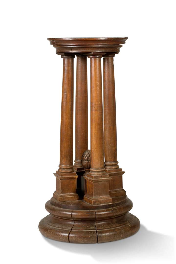 Sellette de présentation en chêne laissé au naturel, constituée de quatre colonnes doriques entourant une pomme de pin, la base circulaire.