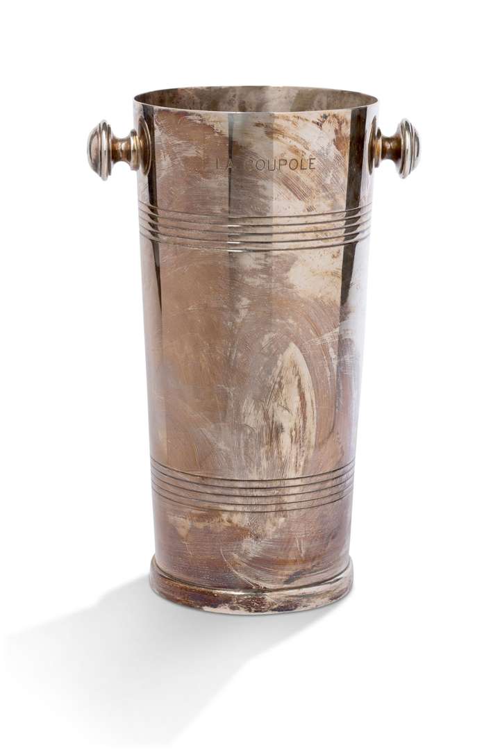 Seau à champagne en métal argenté, le fut cylindrique tronconique agrémenté de filets, les prises circulaires, inscription «La Coupole».