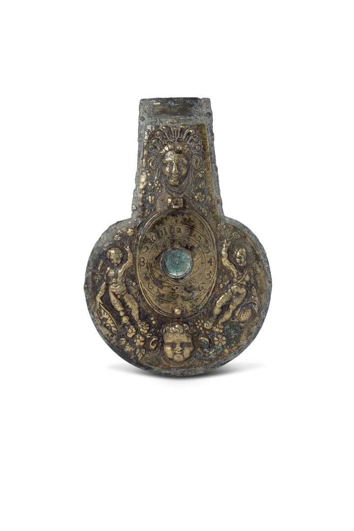Plaque de poire à poudre en bronze patiné ornée d'un cadran solaire au centre de putti et mascaron d'indien.
