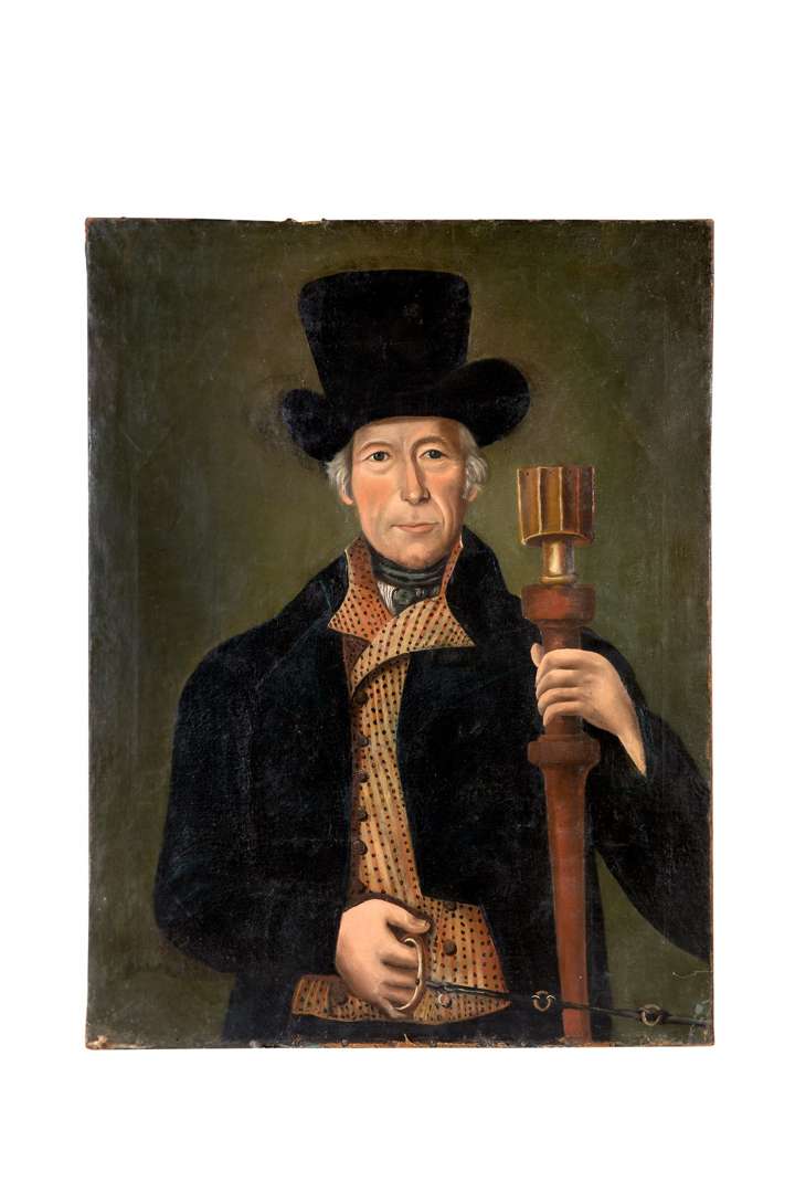 Portrait d'un expert géomètre tenant une équerre d'arpenteur sur son pieu et une chaîne d'arpentage