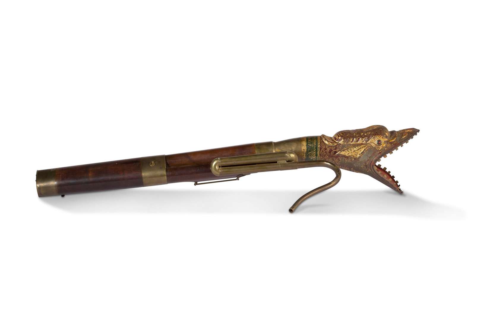 Basson russe ou serpent droit le corps en acajou et garniture en laiton, le pavillon à tête de serpent la gueule ouverte en laiton repoussé polychrome.