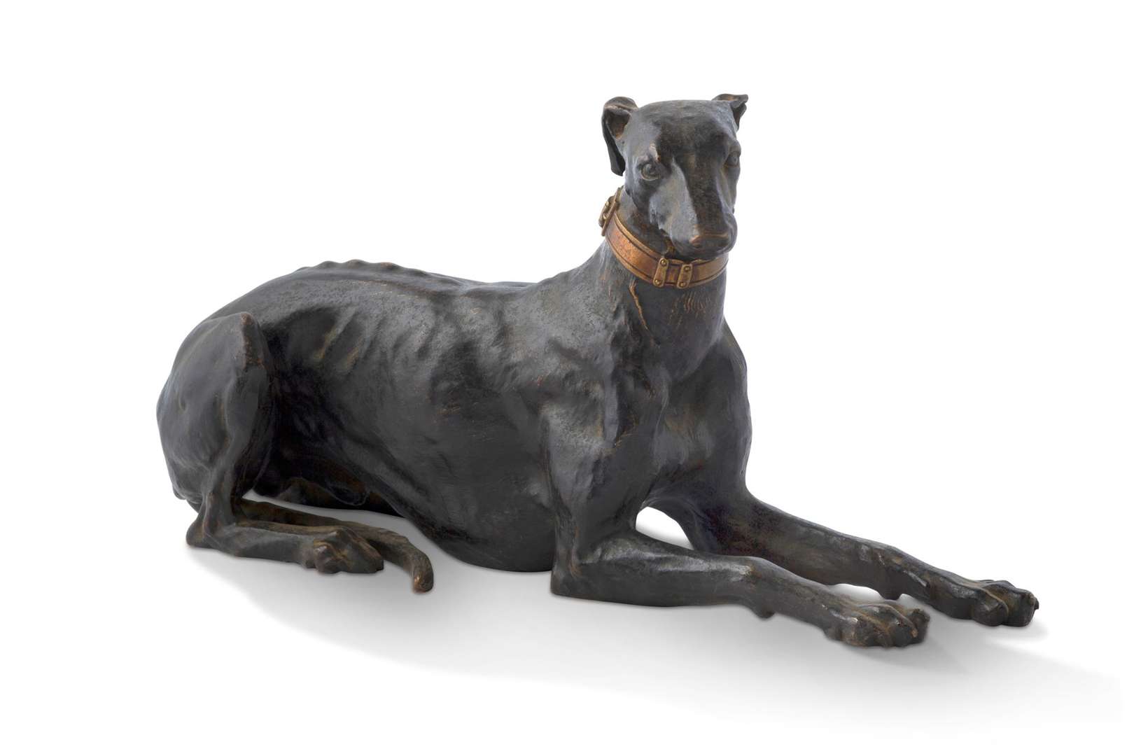 Lévrier en bronze à patine brune en position couchée.