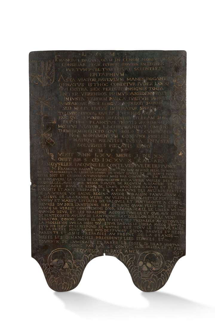 Plaque tumulaire formant obiit et voeux perpetuels en cuivre gravé à la mémoire de François Dagues, sieur de La