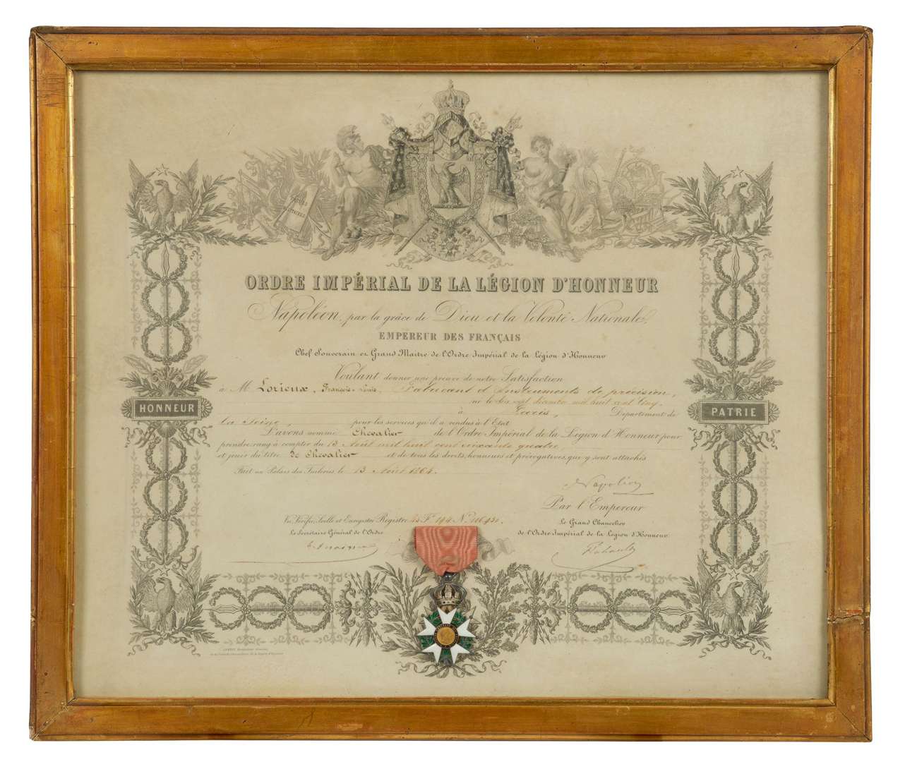 Louis Lorieux, «Frabricant d'Instruments de précisions [...], le 13 Août 1864», dans un cadre en bois doré.