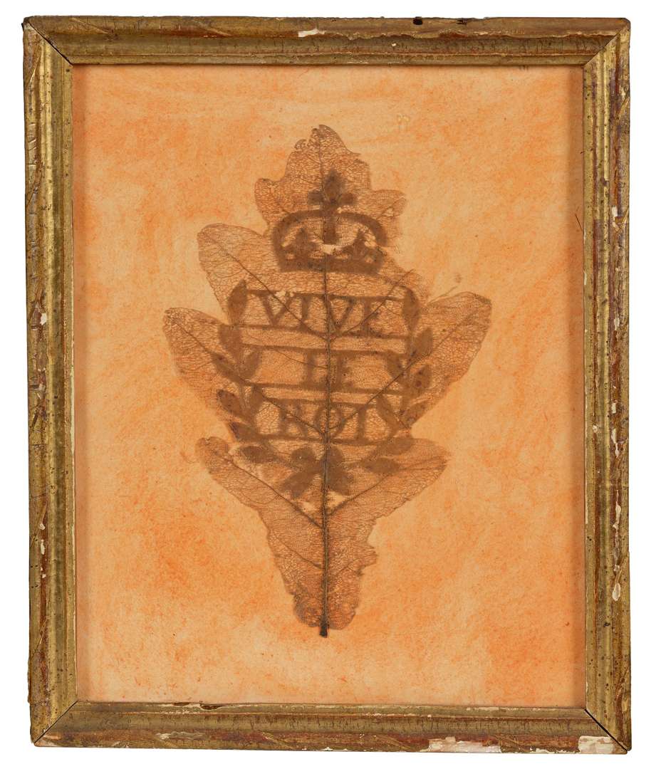 On y joint une feuille de chêne finement taillée portant l'inscription «Vive le Roi».