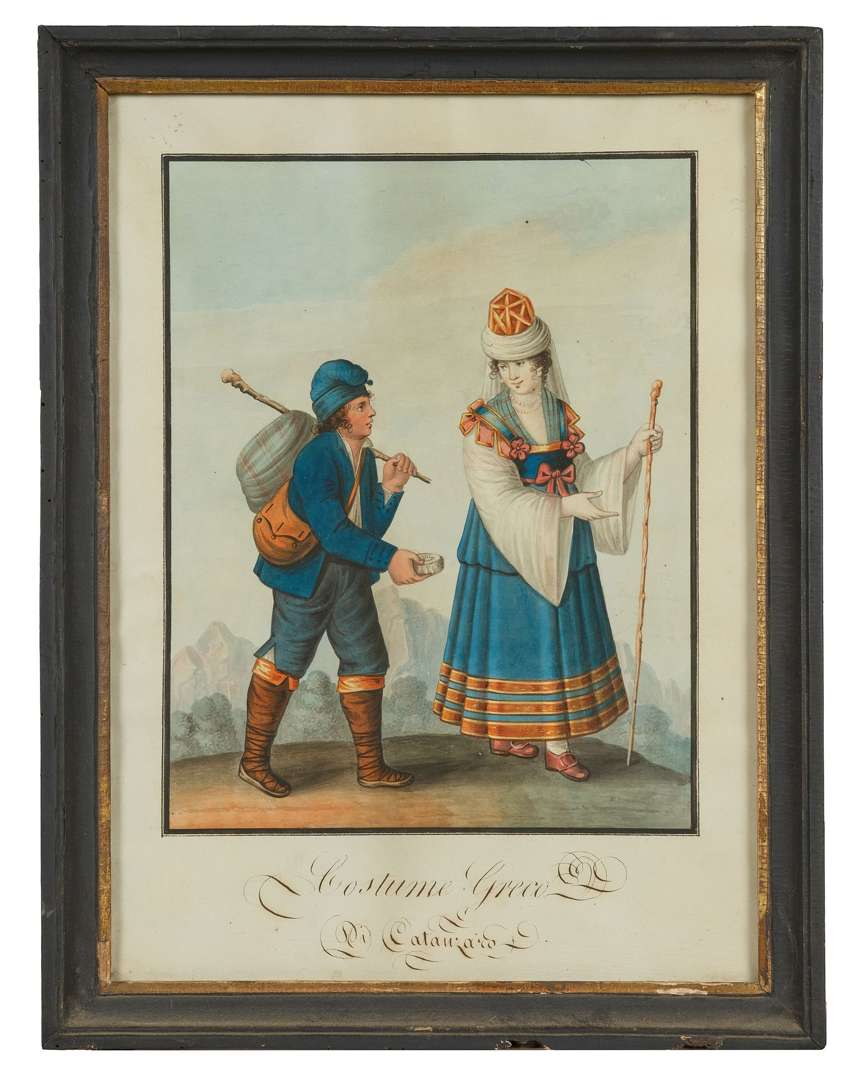 Suite de quatre aquarelles en couleurs sur papier figurant notamment un officier, signé et daté 1835 et une scène de réunion des 3 ordres.