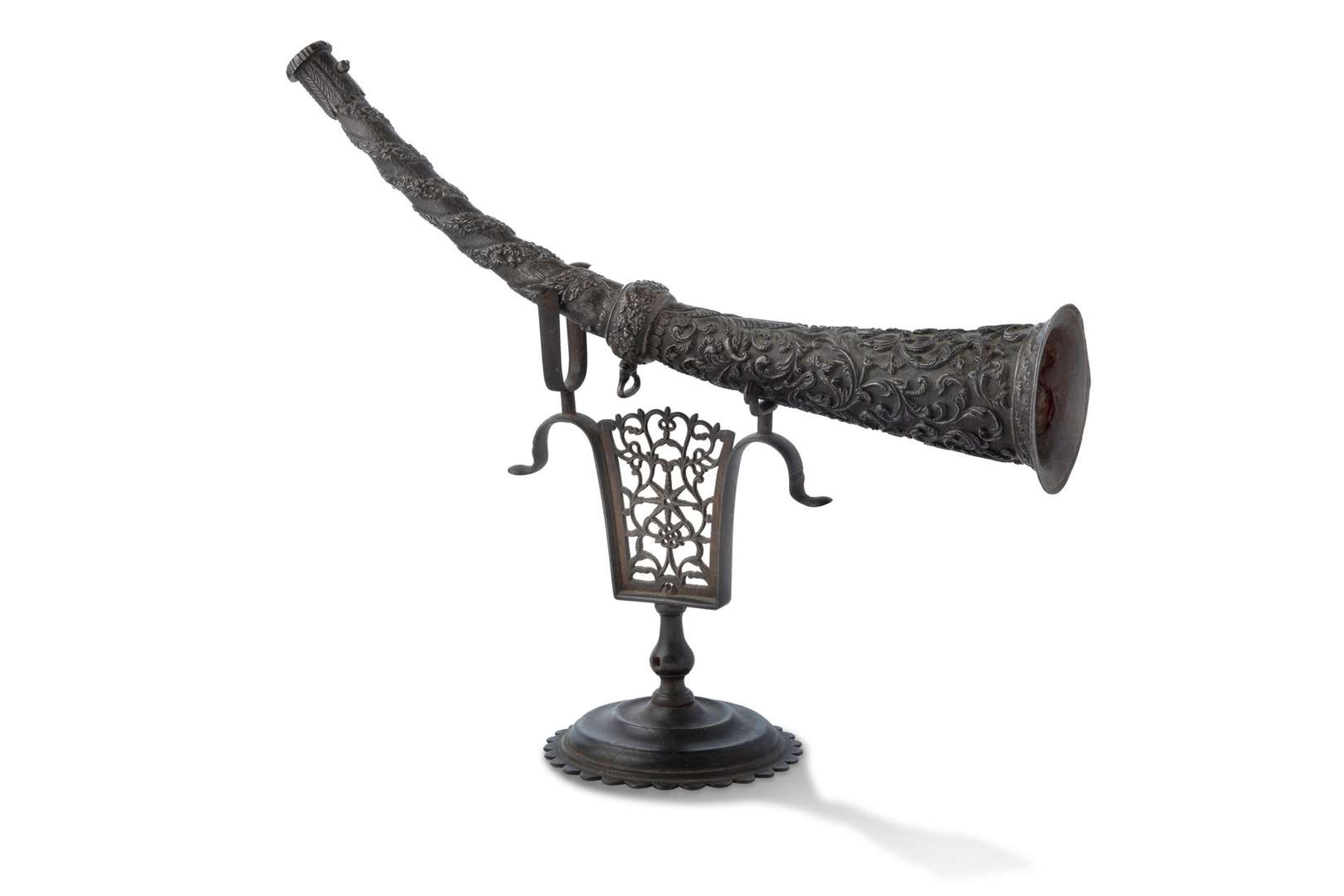 Cor de chasse en acier à patine brune, le fut à l'imitation d'une corne de rhinocéros ornée d'une guirlande feuillagée torse et d'un riche décor de rinceaux et feuilles d'eau, bague centrale à anneaux de suspente.