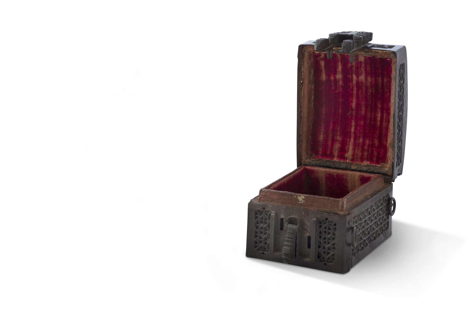 Petit coffret à livre dit «de messager» en fer forgé à âme en bois. Serrure à moraillons.