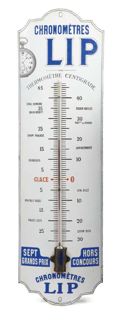 Thermomètre publicitaire des Chronomètres LIP sur plaque émaillée à fond blanc, signé émaillerie Lyonnaise.