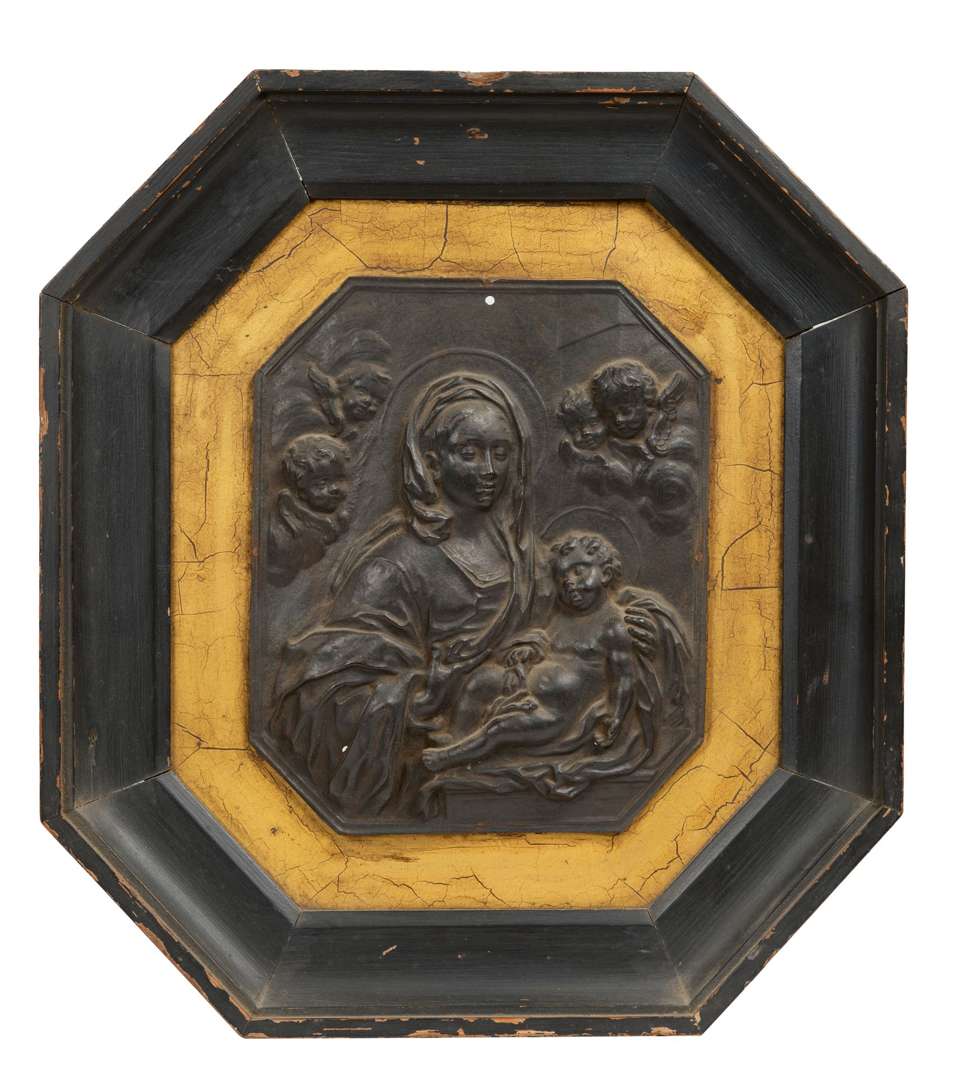 Plaque octogonale en fonte de fer représentant une vierge à l'enfant entourée de putti dans un cadre en bois noirci et doré.