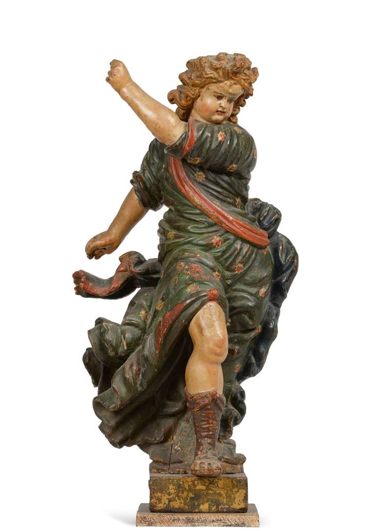 Saint Michel en bois sculpté peint polychrome. Il adopte l'attitude du com