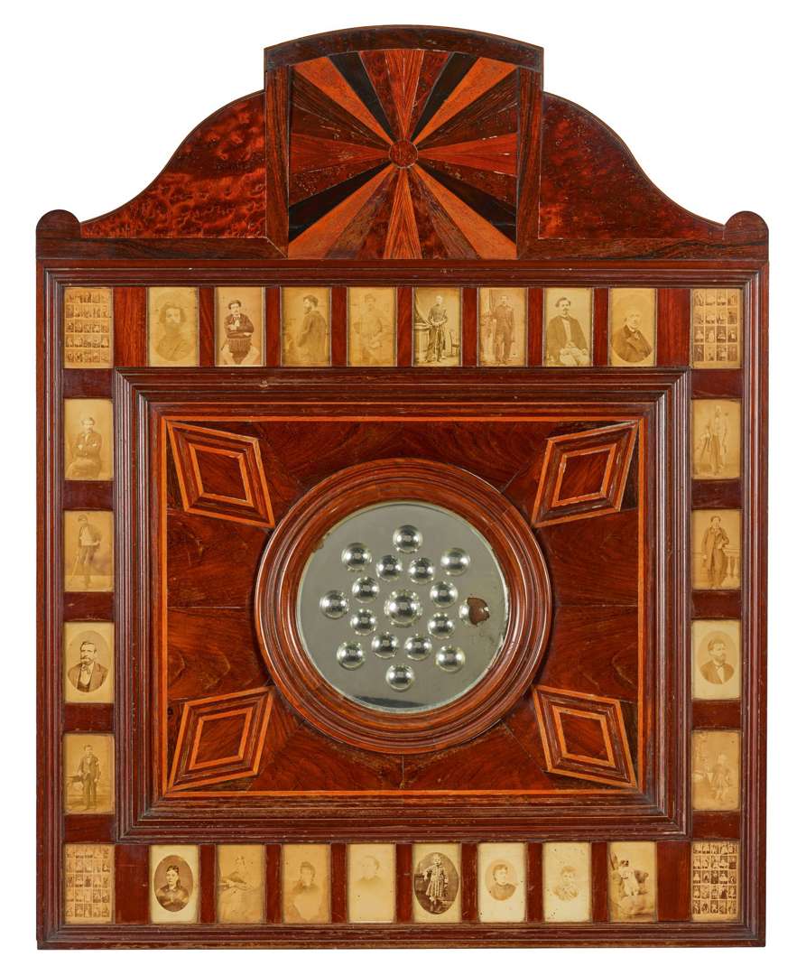 Miroir de sorcière à facettes concaves montées dans un important cadre à fronton en placage de loupe et bois exotique à motif de losanges et d'un soleil rayonnant, le miroir encadré de photos d'hommes, femmes et enfants.