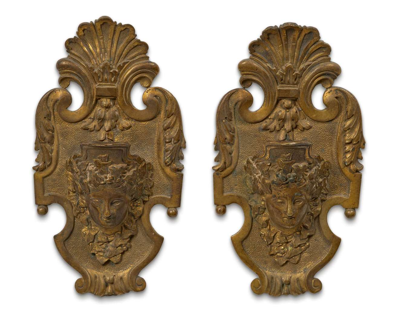 Suite de deux élements de mobilier ou appliques murales en bronze ciselé doré à décor de têtes d'espagnolettes, coquilles et rinceaux feuillagés.