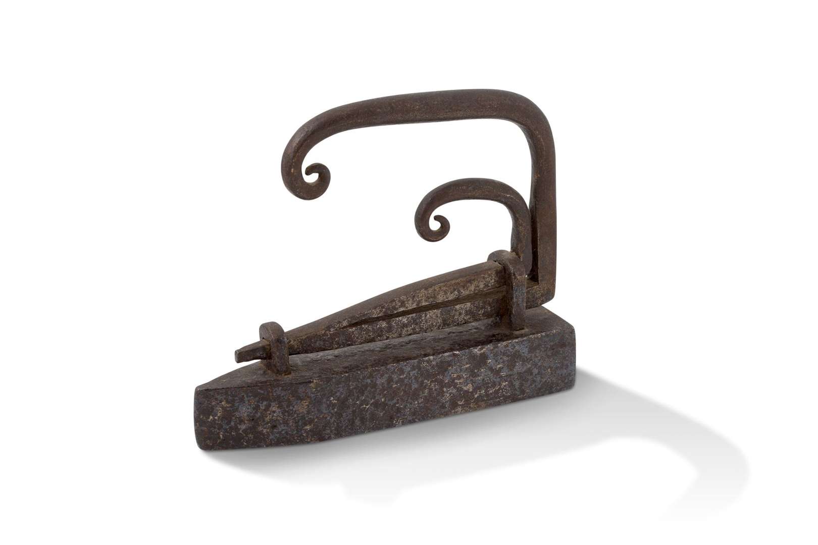 Fer à repasser en fer forgé en forme de lingotin. La poignée supérieure mobile dotée d'un ressort à cran et terminée par deux enroulements.