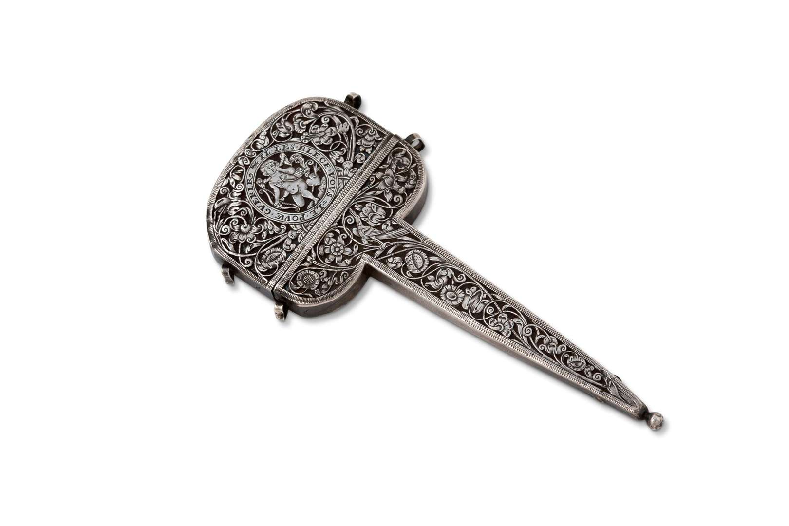 Étui à ciseaux en argent très finement repercé et gravé, sur une âme d'argent. Sur une face, riche décor d'arabesques florales et Cupidon dans un cartouche ovale accompagné de la légende «Il les blece vous le pour guerir». Sur l'autre face le même riche décor surmonté d'un phénix et de la légende «Pour renaitre plus pur».