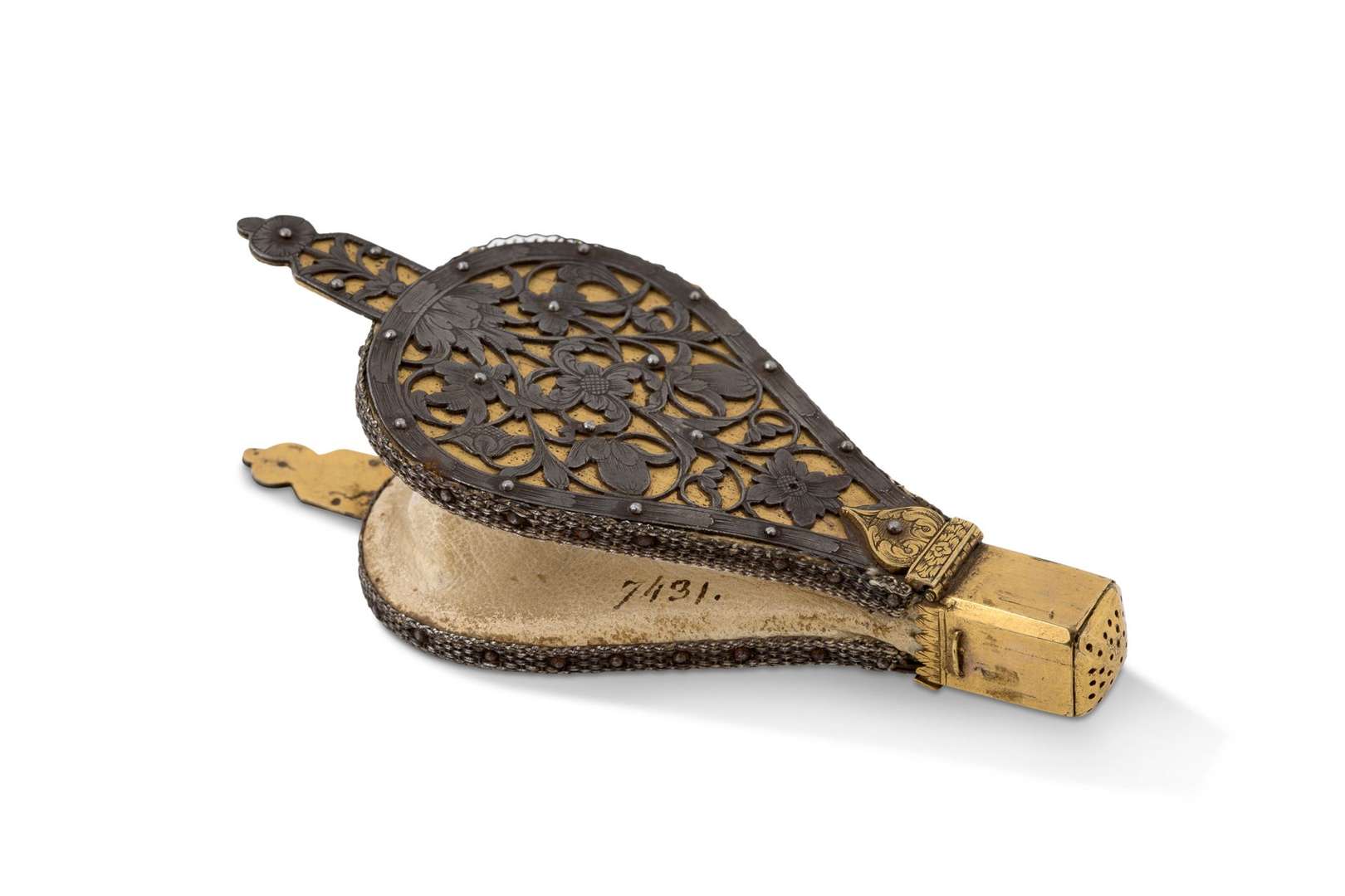 Petit souff let à poudrer en fer repercé et gravé de fleurs sur une âme de cuivre doré. La tête en passoire de cuivre doré à section carrée. La panse de cuir blanc à galons d'argent cloutés.
