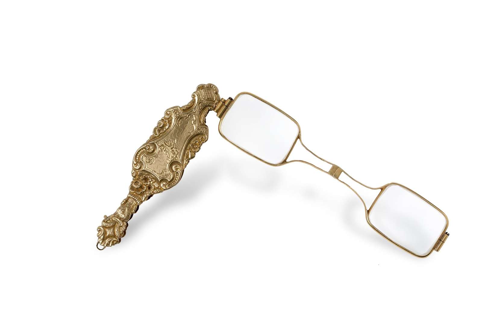 Face-à-main en or jaune 750 °/°° à décor ciselé de fleurs et d'entrelacs.