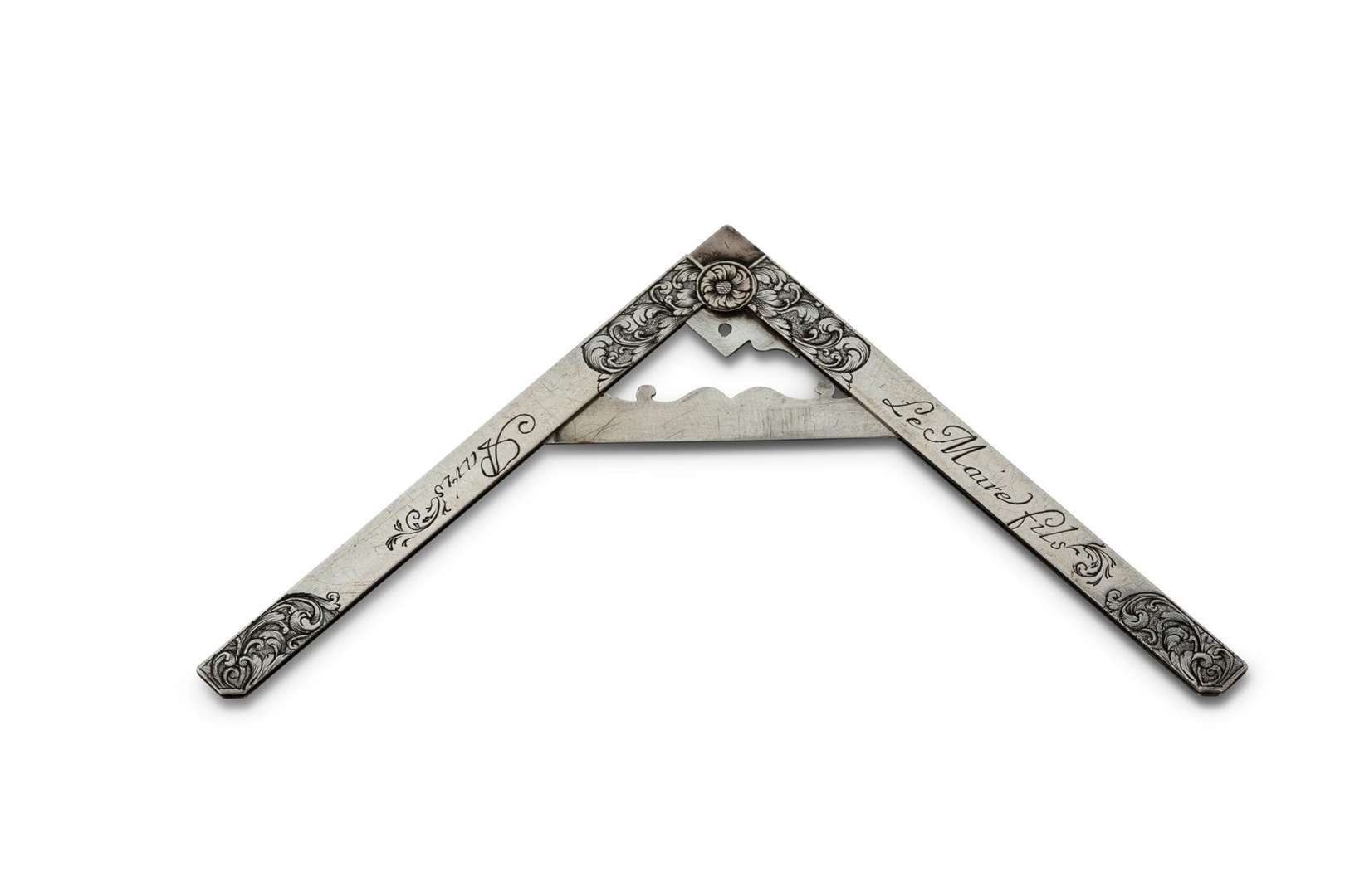 Équerre à niveau pliante formant demi pied de Roy en argent finement gravée de rinceaux et signée «Le Maire fils à Paris».