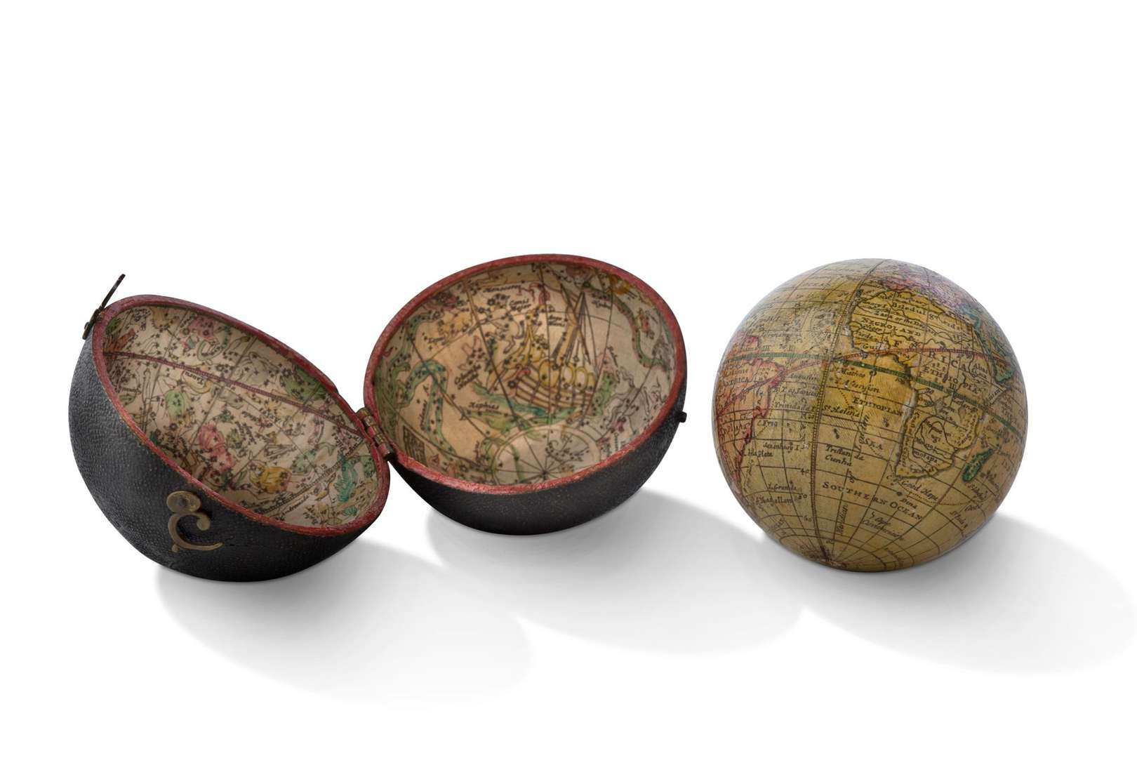 Dans son écrin sphérique gainé de chagrin noir présentant la carte céleste des constellations et portant la mention «A correct Globe with new constelations of Dr Halley & C.».