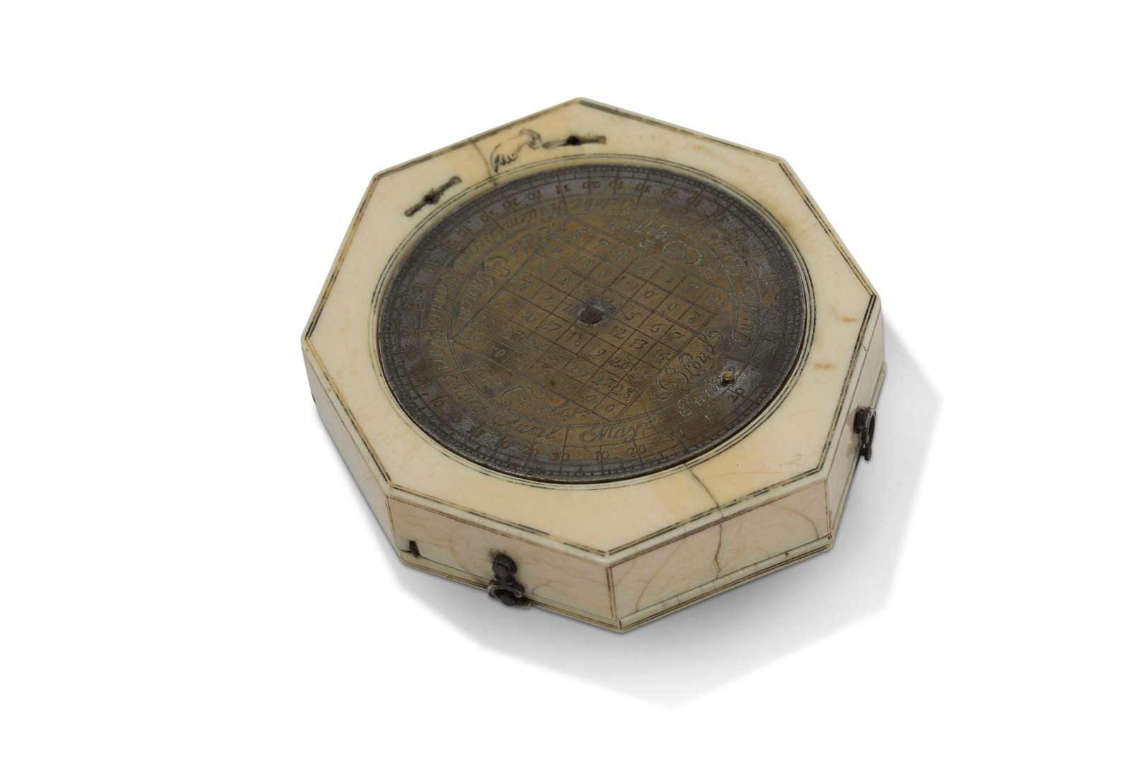 ~ Cadran solaire diptyque analemnatique octogonal en ivoire, la table verticale présentant un cadran à pièces mobiles, la table horizontale à boussole présentant au revers un calendrier perpétuel signé «Charles Bloud à Dieppe».
