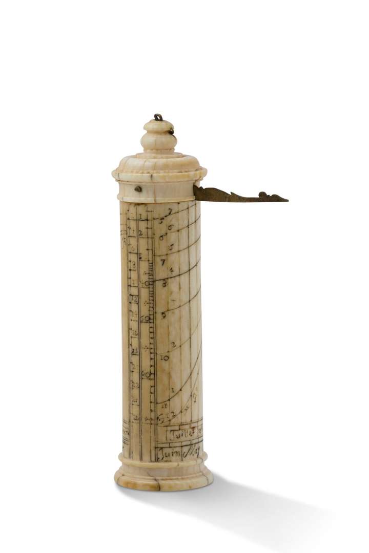 ~ Cadran d'altitude de poche dit «cadran de berger» de forme cylindrique en ivoire gravé, le gnomon rétractable en laiton.