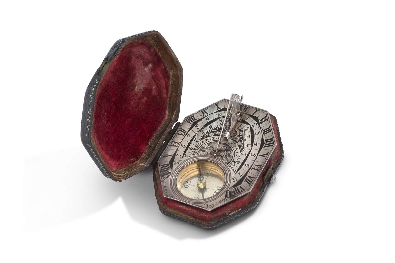 Cadran solaire portatif horizontal en argent de type Butterfield, la platine octogonale à trois divisions horaires gravée d'un paysage lacustre en son centre et signée «Chapotot à