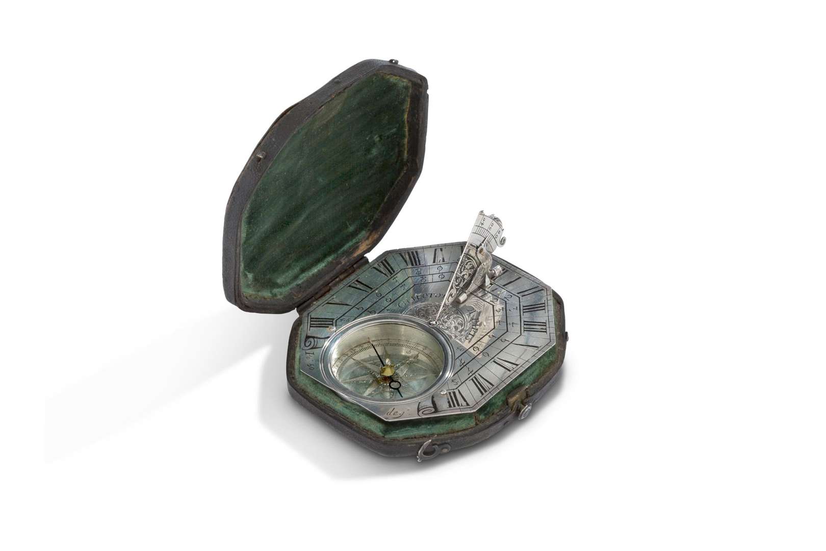 Cadran solaire portatif horizontal en argent de type Butterfield, la platine octogonale à trois divisions horaires gravée de rinceaux en son centre et signée «Chapotot à Paris», gnomon à l'oiseau, le dos gravé des latitudes de villes européennes, la boussole à huit directions, le nord indiqué par une fleur de Lys.