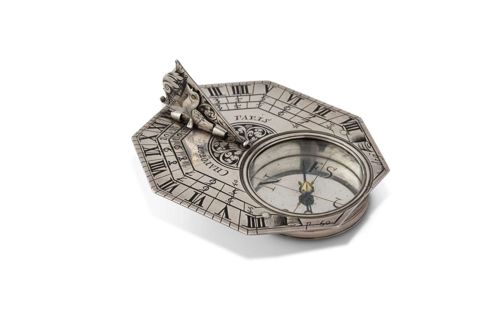Cadran solaire portatif horizontal en argent de type Butterfield, la platine octogonale à trois divisions horaires gravée de rinceaux en son centre et signée «Chapotot à Paris», gnomon à l'oiseau, le dos gravé des latitudes de villes européennes, la boussole à quatre directions, le nord indiqué par une fleur de Lys.
