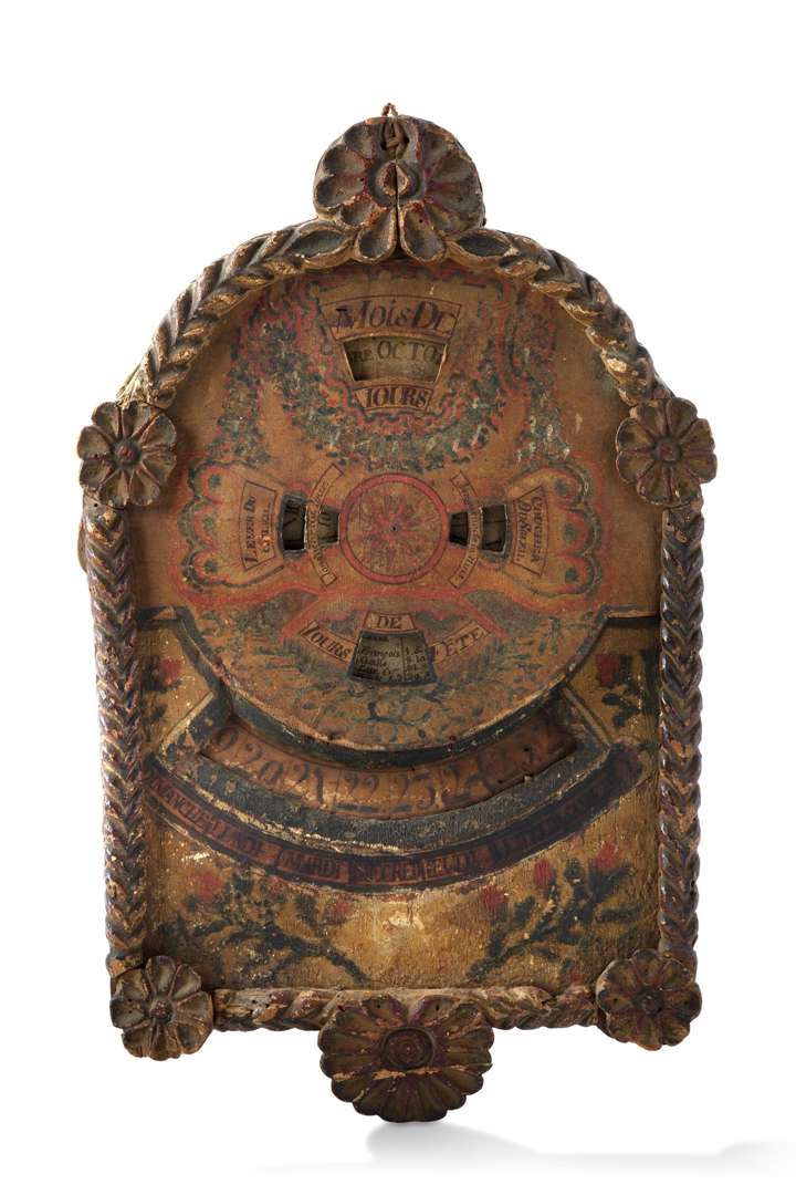 Calendrier perpétuel en bois et carton peint de motifs floraux présentant à l'aide de multiples guichets et par l'action de disques rotatifs les jours de la semaine, mois, lever et coucher du soleil, longueur du jour et de la nuit et les jours de fêtes. Dans un cadre sculpté de chevrons et fleurettes.