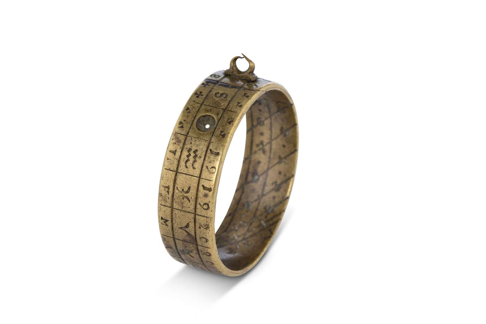 Anneau solaire portatif en laiton patiné et gravé, avec anneau de suspension.