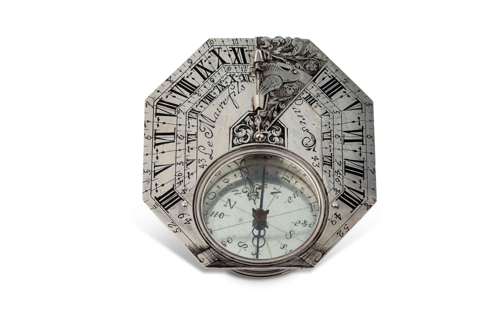 Cadran solaire portatif horizontal en argent de type Butterfield, la platine octogonale à quatre divisions horaires gravée de rinceaux en son centre et signée «Le Maire Fils à